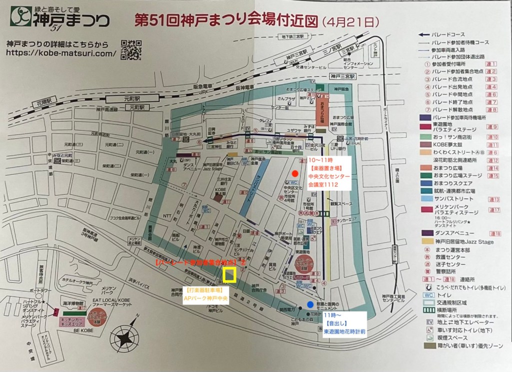 打楽器等を降ろして、10:30までに東遊園地南 花時計広場前へ移動